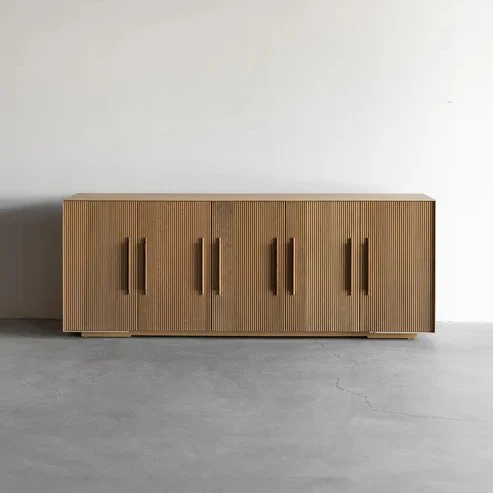 "This modern console features a warm-toned wood finish with a ribbed texture that exudes elegance.