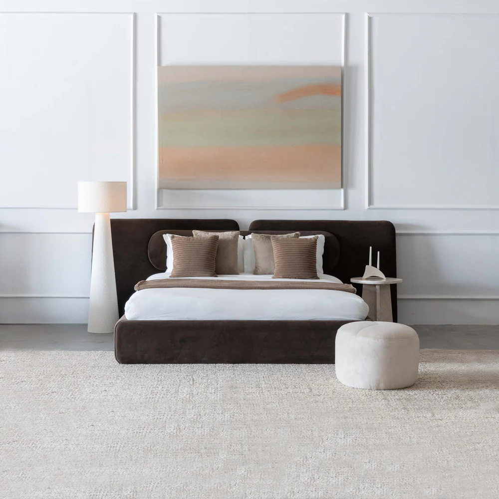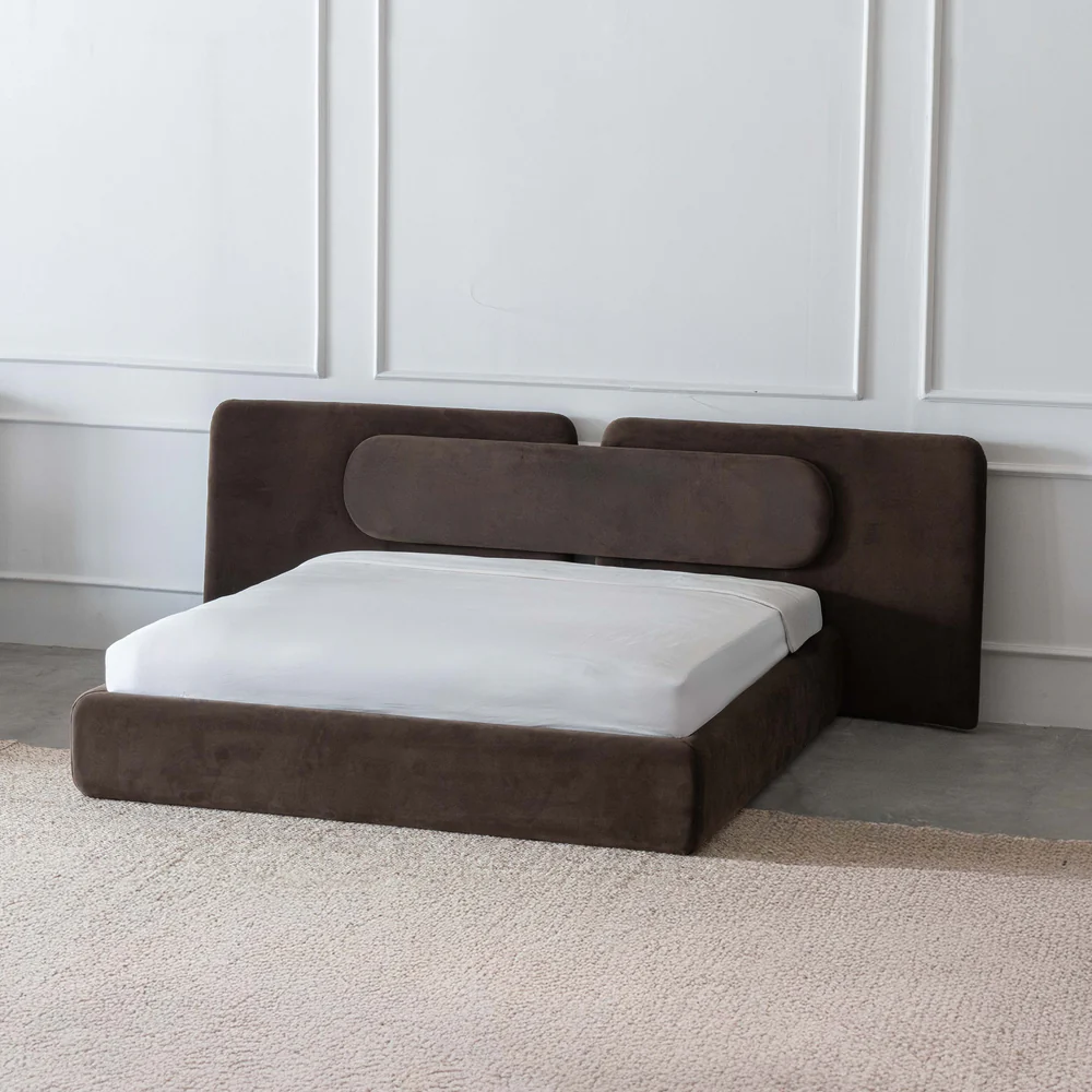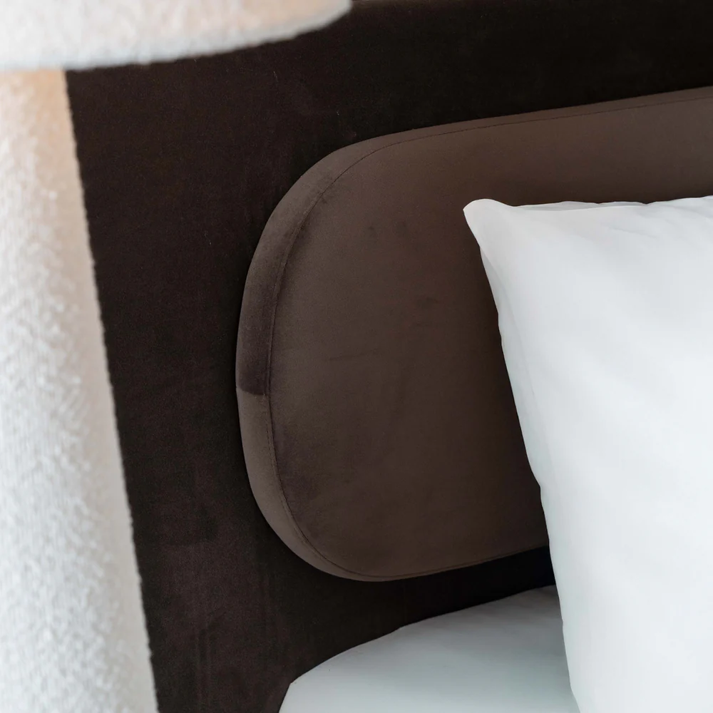 Crafted with strength and elegance, this modern bed offers reliable support and refined comfort. Its smooth, curved design and soft upholstery bring a sense of sophistication and warmth to any bedroom.